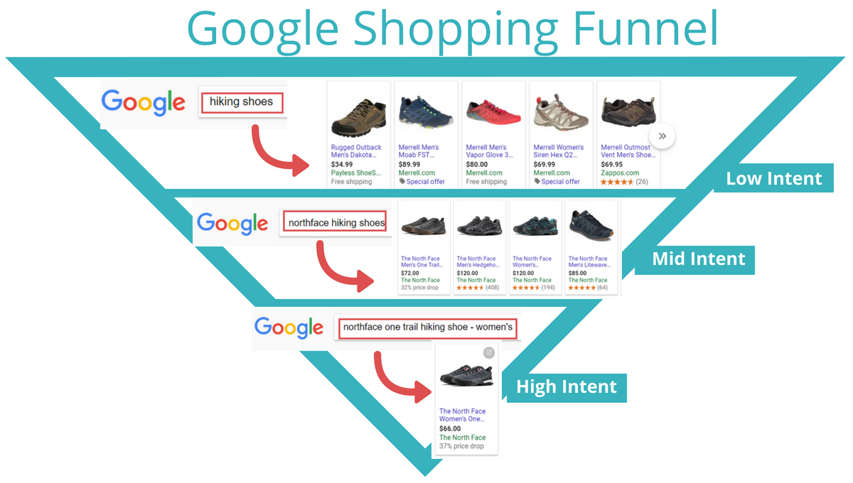 Zaletą Google Shopping jest to, że pomaga sprzedawcom dotrzeć do potencjalnych klientów na każdym etapie lejka sprzedażowego. Neil Patel nazywa lejek zbiorem kroków, które musi podjąć na stronie odwiedzający, zanim dokona konwersji. Lejek sprzedazowy składa się z kilku etapów. Najpierw użytkownicy muszą dowiedzieć się o istnieniu sklepu i marki. Potem poznają lepiej sklep, zapoznają się z asortymentem. Na końcu, kiedy już zaufają sprzedawcy, kupują produkt, a jak wszystko pójdzie dobrze, wracają w przyszłości.