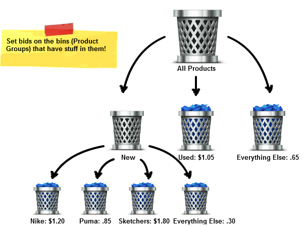 Kierowanie na wszystkie ścieżki sprzedaży w Zakupach Google jest możliwe dzięki segmentacji kampanii. Google udostępnia opcje podziału produktów na grupy (nazywane grupami produktowymi) i ustawiania dla każdej z nich innych stawek. Grupa produktów może składać się nawet z tylko jednego produktu. Grupy powinny być tworzone na podstawie czynników, które różnicują zawarte w nich produkty. Może to być cena, stan, marka, kolor, itp. Poniższa grafika z WordStream świetnie ilustruje tę koncepcję.