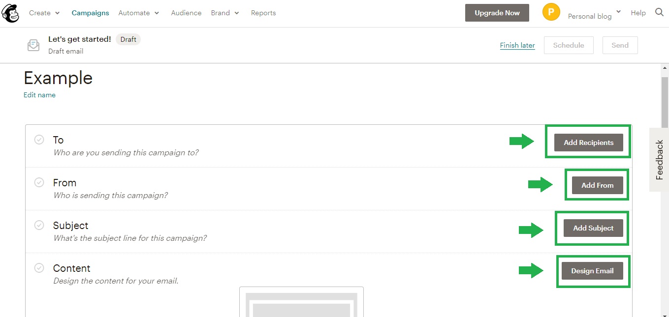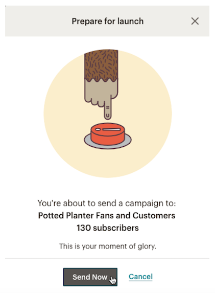 7. W ten sposób wrócisz do poprzedniego menu z punktu 4. Kampania jest gotowa, więc jedyne co pozostało Ci zrobić to kliknąć Send (Wyślij) lub Schedule (Zaplanuj) w prawym górnym rogu. Wybierz tę drugą opcję, jeśli nie chcesz wysyłać maila od razu. Jeśli chcesz, po kliknięciu Send, Mailchimp poprosi Cię o potwierdzenie tej decyzji. Kliknij Send Now (Wyślij Teraz) i gotowe!